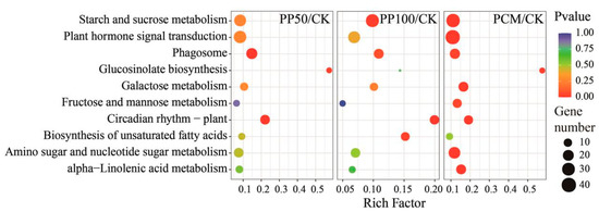 KEGG enrichment analysis of DEGs in E. purpurea leaves upon PAH exposure. Bubble size and color correspond to the gene number and Q value enriched in the pathway. The rich factor indicates the ratio of the number of DEGs mapped to a certain pathway to the total number of genes mapped to this pathway. Abbreviations of groups are indicated in Figure 1.