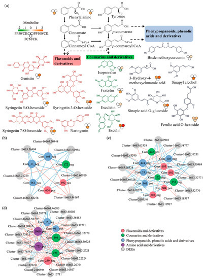 Metabolite accumulation (a) and co-expression analysis of metabolites and genes (b–d) in the phenylpropanoid pathway in E. purpurea leaves upon PAH exposure. In a, the identified DAMs with increased levels were categorized into three classes. In (b–d), a network was constructed for PP50, PP100, and PCM groups, respectively. Color nodes represent DAMs, and grey nodes represent DEGs. Red or blue edges represent positive or negative correlations, respectively. Abbreviations of groups are indicated in Figure 1.