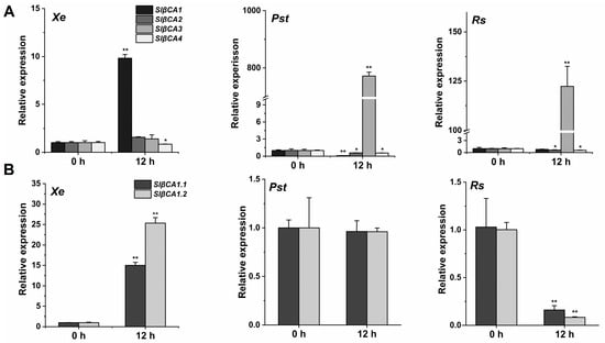 Xanthomonas euvesicatoria (Xe) 85-10 upregulated SlβCA1 expression. (A) In leaves of 6 weeks old, SlβCA1, SlβCA2, SlβCA3 and SlβCA4 expression levels at 0 and 12 h after spray inoculation with Xe 85-10, Pseudomonas syringae pv. Tomato (Pst) DC3000 and Ralstonia solanacearum (Rs) ZJ3721. The gene amount in the 0 h (untreated) sample was assigned a numerical value of 1. (B) Transcript abundance of SlβCA1 in response to Xe 85-10, Pst DC3000 and Rs ZJ3721 at 0 h and 12 h. The gene amount in the 0 h (untreated) sample was assigned the numerical value of 1. The asterisks indicate statistical significance by t test (** p < 0.01; * p < 0.05).