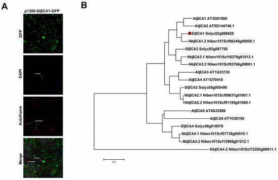 We expressed green fluorescent protein (GFP)-SlβCA1 in N. benthamiana cells to determine the subcellular localization of SlβCA1. The GFP signal observed in tobacco cells indicated that SlβCA1 was localized in the nucleus and chloroplast and near the cell membrane (Figure 2A).