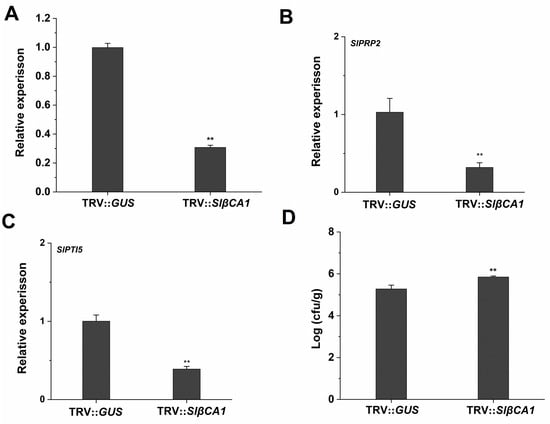 To study the role of SlβCA1 in the response to pathogen infection, we silenced SlβCA1 in tomato (TRV-SlβCA1) and used tomato with glucuronidase silenced (TRV-GUS) as a negative control (Figure 3A). The expression level of the resistance-related genes SlPR-P2 and SlPTI5 in TRV-SlβCA1 was significantly reduced compared to that in TRV-GUS in response to pathogens, when this response was measured 24 h after Xe 85-10. These results suggest that SlβCA1 may be involved in plant immunity to Xe 85-10 (Figure 3B,C).