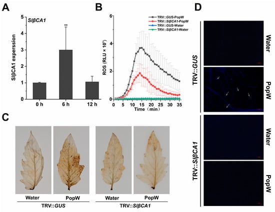 The N-terminal Harpin domain of PopW is involved in the regulation of the plant immune response []. To further investigate the role of SlβCA1 in PopW-induced resistance, we also examined PopW-induced ROS accumulation and callose staining during pathogen infection. In the PopW treatment, the accumulation of ROS and callose in TRV-SlβCA1 was less than that in TRV-GUS (Figure 6A,B).