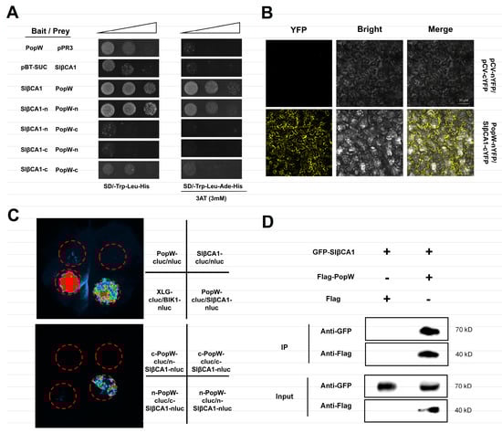 PopW and SlβCA1 interact directly. (A) Y2H. The interaction between pBT3-SUC-PopW and pPR3-SlβCA1 and the interaction between pBT3-SUC and pPR3 were used as negative controls,. pBT3-SUC-PopW and pPR3 and pPR3-SlβCA1 and pBT3-SUC showed self-activation. (B) BIFC. YFP fluorescence was observed by confocal microscopy. The interaction of nYFP and cYFP was used as a negative control. Scale bar = 50 μm. (C) LCA. The fluorescence signal intensity represents the interaction of two proteins. SlβCA1 and PopW interacted with a no-load on the other side, indicating self-activation. The interaction of nluc and cluc was used as a negative control. (D) COIP to test the SlβCA1-GFP and PopW-Flag interaction, using GFP-SlβCA1 and Flag as negative controls. Protein molecular weights: PopW = 39.79 kDa; SlβCA1 = 34.47 kDa.