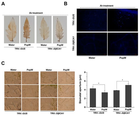 Both PopW and CA have been reported to be involved in stomatal regulation [,,,]. Stomatal immunity is a typical defense response. We analyzed stomatal opening and closing in SlβCA1-silenced plants after treatment with Xe 85-10. In the PopW treatment group, the silencing of SlβCA1 significantly increased stomatal opening, which was more conducive to pathogen invasion (Figure 6C). This result was also consistent with the increased sensitivity of TRV-SlβCA1 to pathogens (Figure 7C).
