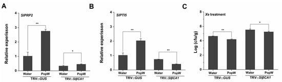 SlβCA1 can upregulate PopW-induced resistance genes in Xe 85-10 defense. (A,B) The expression levels of SlPRP2 and SlPTI5 in tomato leaves after 24 h of Xe 85-10 spraying treatment. The amount of the gene in the TRV-GUS sample was assigned a numerical value of 1. (C) Bacterial colonization on leaves. The measurement was carried out after 4 d of Xe 85-10 spraying treatment. The asterisks indicate statistical significance by t test (** p < 0.01; * p < 0.05).