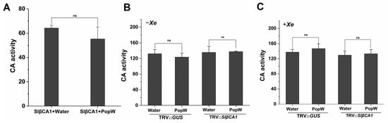 CA activity is not related to the immune function of SlβCA1. (A) Effect of PopW on the CA activity of recombinant His-SlβCA1 protein. (B) CA activity in leaves after PopW or water treatment for 12 h. (C) CA activity in leaves after inoculation with Xe 85-10 for 12 h. ns indicates no significant difference.