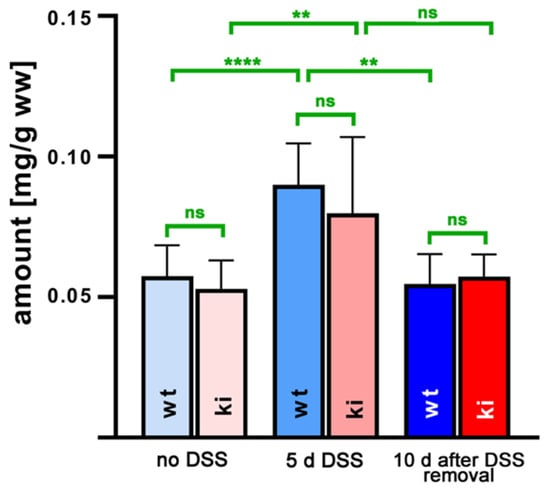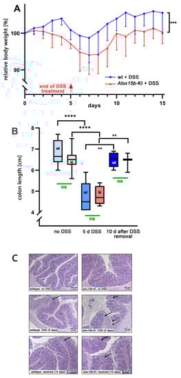 3.1. Alox15-KI Mice Lose Significantly More Body Weight during the Time Course of DSS-Induced Colitis