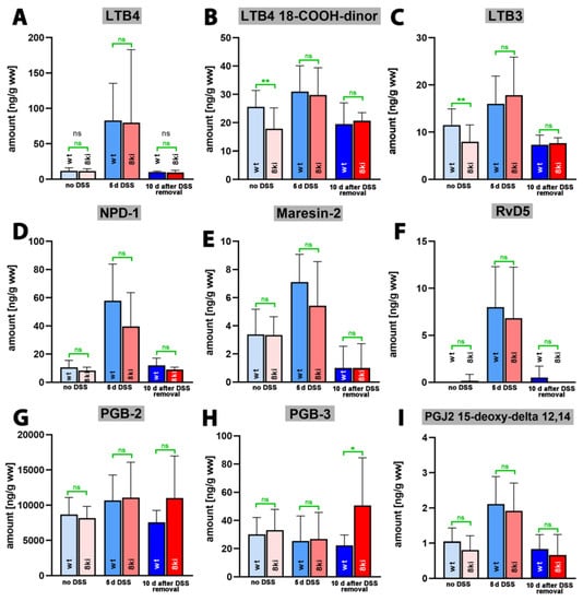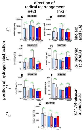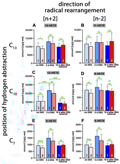 2.3. Oxilipin Profiles in Colon Tissues of Alox15b-KI Mice and Wildtype Controls during the Time-Course of DSS-Induced Colitis