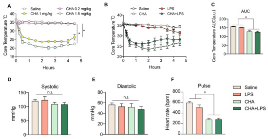 CHA induces a stable torpor state upon LPS infection. (A) The core temperature of mice received i.p. injection of saline and three dosages of CHA (0.2 mg/kg, 1 mg/kg, and 1.5 mg/kg). The mice received an i.p. injection of 1.5 mg/kg of CHA, together with or without 4 mg/kg LPS. The core temperature was recorded in (B), and the area under the curve of (B) was plotted in (C). The systolic pressure (D), diastolic pressure (E), and heart rate (F) were also recorded in all four groups. CHA: N6-cyclohexyladenosine. n.s. = not significant. p < 0.05 for *.