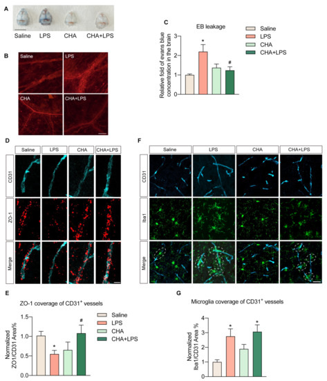 CHA reduces the LPS-induced blood–brain barrier leakage. (A) The photo of skulls from four groups of animals after Evans’ blue injection. (B) The immunofluorescence of Evans blue in the meninges of the skull. (C) Relative concentration of Evans blue dye extravasation into the brain of four groups. (D) Co-staining of anti-CD31 and anti-ZO-1. (E) Quantification of ZO-1 coverage of CD31+ vessels in (D). (F) Co-staining of anti-CD31 and anti-Iba1. (G) Quantification of microglia coverage in CD31+ vessels in (F). p < 0.05 for * vs. the saline group, p < 0.05 for # vs. the LPS group. Scale bar = 1 mm in (A), 100 µm in (B), 25 µm in (D), and 10 µm in (F).