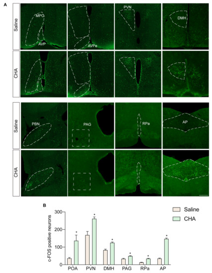 Whole brain tracing of neural circuit activated by CHA. (A) c-Fos staining of POA, PVN, DMH, PBN, PAG, RPa, and AP nucleus. (B) Quantification of c-Fos-positive neurons in (A). POA: preoptic area; MPO: medial preoptic area; AVP: anterior ventral preoptic area; PVN: paraventricular nucleus; DMH: dorsal medial hypothalamus; PBN: parabrachial nucleus; PAG: periaqueductal gray; RPa: raphe pallidus; AP: area postrema. p < 0.05 for *. Scale bar = 200 µm.