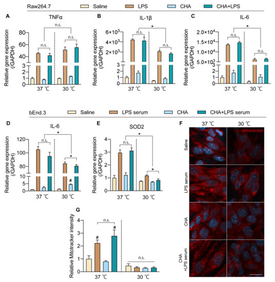 CHA-induced torpor inhibits inflammatory responses of macrophages and oxidative stress in brain endothelial cells. (A–C) mRNA levels of pro-inflammatory cytokines (TNF-α, IL-1β, and IL-6) in macrophages at 37 °C and 30 °C after LPS stimulus with or without CHA. (D,E) mRNA levels of IL-6 and SOD2 in bEnd.3 cells at 37 °C and 30 °C after LPS stimulus with or without CHA. (F) Mitochondria activity is evidenced by the mitotracker probe under the same settings of (D,E). (G) Quantification of mitotracker intensity in (F). n.s. = not significant. Dotted lines are just to separate two groups for easier understanding. p < 0.05 for *. p < 0.05 for # vs. the saline group. Scale bar = 10 µm in (F).