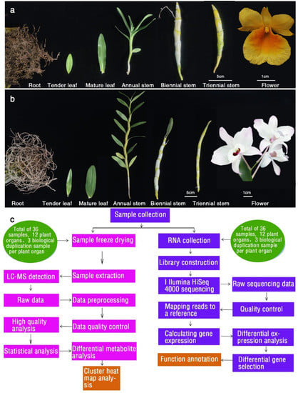 D. capillipes and D. nobile plants were grown in a semiautomatic greenhouse (70% natural light intensity and temperatures ranging from 25 to 28 °C) at the Chinese Academy of Forestry (Beijing, China). On 15 January 2019, three-year-old plants with well-developed pseudobulbs were transferred to a controlled thermoperiodic chamber (RXM Smart climate box (Ningbo, Zhejiang)) regulated at 18 °C (light)/13 °C (dark), with a photoperiod of 12 h (320 µmol m−1 s−1 PPF (13–15 molm−2d−1 of photosynthetic photons)) provided by fluorescent and incandescent lamps and a mean relative humidity of 70–80% for 30 d [10]. A completely randomized design with 10 single plant replicates for each treatment was used. Plants collected on 15 February 2019 were used as study materials. Six D. capillipes tissues (root (DG), young leaf (DYY), mature leaf (DYC), annual stem (DJ1), biennial stem (DJ2), and triennial stem (DJ3) tissues) (Figure 1a), and six D. nobile tissues (root (JG), young leaf (JYY), mature leaf (JYC), annual stem (JJ1), biennial stem (JJ2), and triennial stem (JJ3) tissues) (Figure 1b) were manually dissected, flash frozen in liquid nitrogen, and kept at −80 °C. The experimental design and analysis pipeline are shown in Figure 1c. Each tissue was represented by 3 biological replicates, for a total of 36 samples. We selected a total of 30 Dendrobium plants (10 Dendrobium plants constituted one biological replicate) to collect samples.