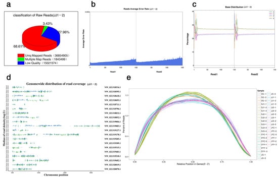 The initial sequence obtained after sequencing was used for a subsequent analysis after a series of quality control steps (Figure 2a). First, the distribution of the sequencing error rate was evaluated (Figure 2b). The error rate of each sequenced base was determined according to the Phred score (Qphred) by the formula (1: Qphred = −10 log10(e)), and the Phred value was subjected to a base-calling analysis. The probability model showed that this model can accurately predict the error rate of base discrimination. Subsequently, the distribution of the A/T/G/C content was investigated to determine the presence or absence of AT and CG separation (Figure 2c). In addition, the clean data obtained by filtering the raw data and the clean reads were compared to the chromosome data (Figure 2d). The raw count was homogenized for all samples by the log2 (count +1) method, and distribution density statistics were calculated (Figure 2e).