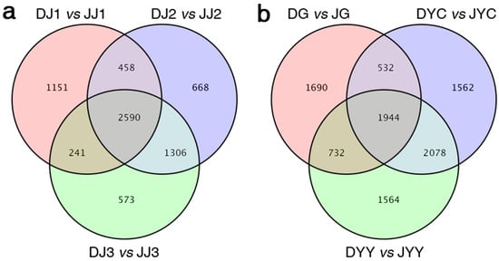 Venn diagram showing differentially expressed genes in the same stem organs of the two species (a) and in the same root, young leaf, and mature leaf organs of the two species (b). D. capillipes tissues (root (DG), young leaf (DYY), mature leaf (DYC), annual stem (DJ1), biennial stem (DJ2) and triennial stem (DJ3) tissues), and D. nobile tissues (root (JG), young leaf (JYY), mature leaf (JYC), annual stem (JJ1), biennial stem (JJ2), and triennial stem (JJ3) tissues).