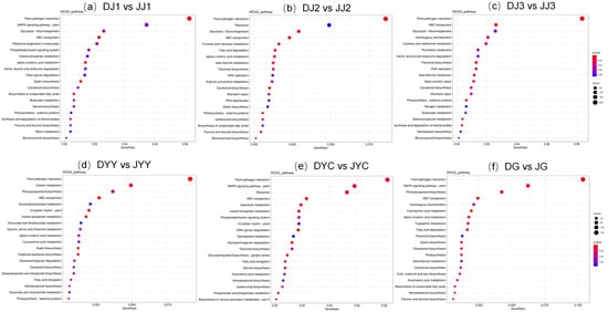 To further reveal the potential roles of the DEGs in biological functions, KEGG enrichment analysis of DEGs was performed for comparisons of DG vs. JG, DJ1 vs. JJ1, DJ2 vs. JJ2, DJ3 vs. JJ3, DYC vs. JYC, and DYY vs. JYY, which was plotted as a scatter diagram (Figure 4). The degree of KEGG enrichment was determined based on the Q-value, rich factor, and the number of genes in a given pathway. The results revealed that DEGs were mainly enriched in the categories of plant–pathogen interaction pathways, ABC transporters, ribosomes, fatty acid degradation, flavonoid biosynthesis, carotenoid biosynthesis, and flavone and flavonol pathways. For each comparison, the 20 most significantly enriched pathway entries are shown (Figure 4), or all entries are shown if less than 20 pathway entries were enriched. The results showed that the pathways associated with flavonoid biosynthesis and flavone and flavonol were enriched. In particular, flavonoid biosynthesis pathways and flavone and flavonol pathways were all significantly enhanced for DJ2 vs. JJ2 and DG vs. JG, “flavonoid biosynthesis” was enriched in DJ3 vs. JJ3 and DYC vs. JYC (Figure 4), and “flavone and flavonol biosynthesis” was enriched in DJ1 vs. JJ1 (Figure 4, Table S2). Flavonoid biosynthesis pathways and flavone and flavonol pathways were detected in DJ2 vs. JJ2, and we hypothesize that DEGs in these two metabolic pathways have important effects on the formation of the yellow color.