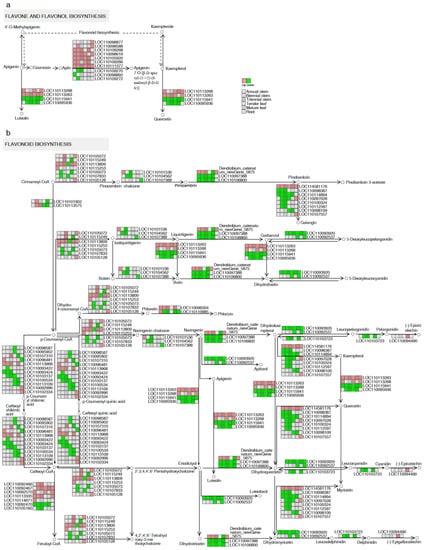 Schematic overview of the major flavonoid biosynthesis pathway of different genes in the tissues of D. capillipes and D. nobile. The flavone and flavonol biosynthesis pathway (a) and the flavonoid biosynthesis pathway (b) are shown.