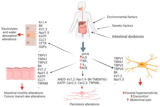 Increased IP has been linked to generating symptoms in IBS [113], including VH [85]. Ion channels are directly involved in regulating intestinal motility and spontaneous contractions. Several research groups related the dysfunction of ion channels and AQP channels to the manifestation of permeability and motility dysregulation in the IBS pathophysiology.