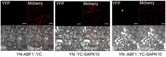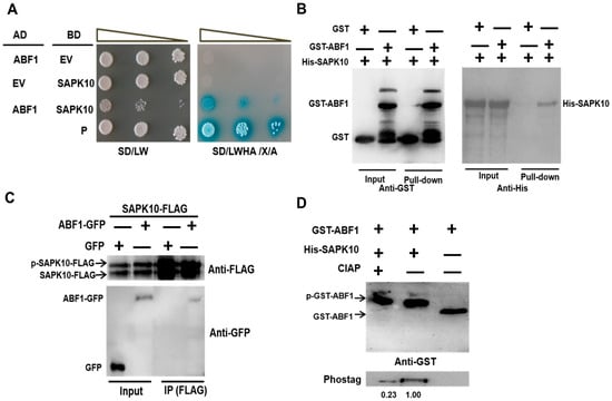 2.2. SAPK10 Directly Interacts with and Phosphorylates ABF1