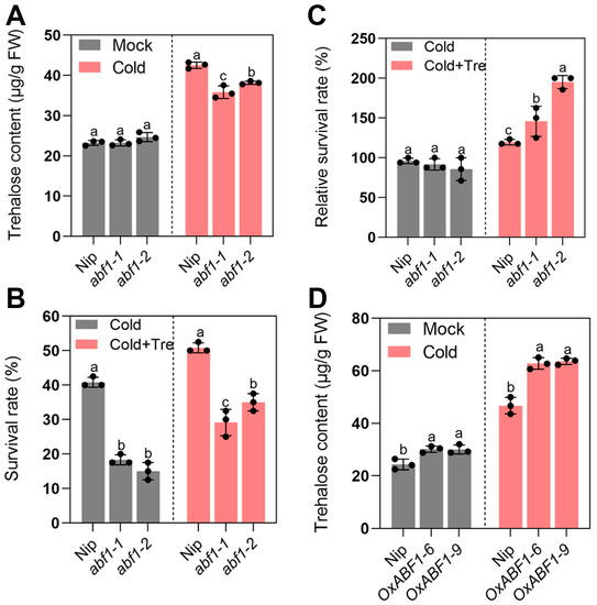 2.4. abf1 Inhibits Seedling Cold Adaptation by Interfering with Trehalose Homeostasis