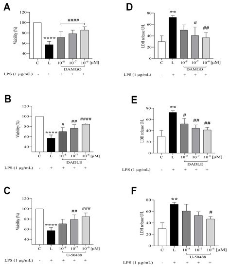Effects of LPS and opioid receptor agonists on cell viability and LDH release. C8-B4 cells were either untreated (control, C) or pretreated with different concentrations (0.01–1 µM) of DAMGO (A,D), DADLE (B,E), and U-50488 (C,F) for 1 h and then incubated in the presence of LPS (1 µg/mL, L) for 24 h. Cell viability was determined using the MTT assay, and cytotoxicity of LPS was determined using the Cytotoxicity Detection KitPLUS LDH (Merck). Data are presented as means ± SEM of three independent experiments performed in triplicate (n = 3) (** p < 0.01, **** p < 0.0001 compared with the control; # p < 0.05, ## p < 0.01, ### p < 0.001, #### p < 0.0001, compared with LPS-treated group).