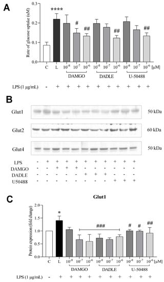 Effect of LPS and opioid ligands on glucose uptake and GLUTs expression. C8-B4 cells were either untreated (control, C) or pretreated with different concentrations (0.01–1 µM) of DAMGO, DADLE, and U-50488 for 1 h and then incubated in the presence of LPS (1 µg/mL, L) for 24 h. Glucose uptake (A) was measured using the Glucose Uptake-Glo Assay (Promega). Expression of GLUTs was determined by Western blot analysis (B), and relative GLUT1 levels were expressed as fold changes compared with control (C). Values represent the mean ± SEM of three independent experiments (n = 3) (* p < 0.05, **** p < 0.0001, compared with the control; # p < 0.05, ## p < 0.01, ### p < 0.001 compared with LPS-treated group).