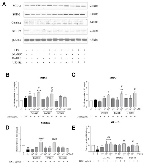 Effect of LPS and opioid receptor agonists on the expression of selected antioxidant markers. C8-B4 cells were either untreated (control, C) or pretreated with opioid ligands (DAMGO, DADLE, U-50488) at a concentration of 0.01–1 µM for 1 h and then incubated in the presence of LPS (1 μg/mL, L) for 24 h. The levels of selected antioxidant enzymes were determined by Western blot analysis (A), and the relative levels of SOD2 (B), SOD3 (C), catalase (E), and GPx 1/2 (D) were expressed as fold changes compared with the control. Values represent the mean ± SEM of three independent experiments (n = 3) (* p < 0.05, ** p < 0.01, *** p < 0.001, compared with control; # p < 0.05, ## p < 0.01, #### p < 0.0001 compared with LPS-treated group).