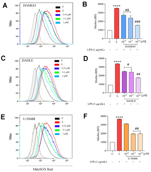Effect of LPS and opioid ligands on mitochondrial ROS. C8-B4 cells were either untreated (control, C) or pretreated with opioid ligands (DAMGO, DADLE, U-50488) at various concentrations for 1 h and then incubated in the presence of LPS (1 μg/mL, L) for 24 h. Mitochondria ROS were assessed by flow cytometric analysis using MitoSOX red probe. Representative flow cytometric histograms (left panels) and analyses (right panels) of each experimental group: DAMGO (A,B), DADLE (C,D), and U-50488 (E,F). Values represent the median ± SEM from 3 independent experiments (n = 3) (**** p < 0.0001 compared with control; # p < 0.05, ## p < 0.01, ### p < 0.001 compared with LPS-treated group).