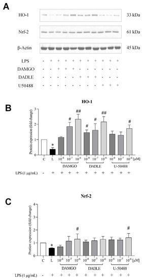 A recent study has shown that morphine can activate Nrf2, which in turn leads to increased transcriptional activation of HO-1 expression [31]. Previous research also suggested that morphine-induced anti-inflammatory effects can occur through Nrf2 and HO-1 activation [32]. Here, we examined whether ORs activation by DAMGO, DADLE, and U-50488 may affect the expression of Nrf2 and HO-1. Western blot analysis showed that after treatment with LPS, the expression of Nrf2 and HO-1 was downregulated, whereas pretreatment of cells with selected opioid ligands (DAMGO and U50488) upregulated Nrf2 and especially HO-1 in a dose-dependent manner (Figure 7). Exposure of C4-B4 cells to opioid receptor agonists alone did not significantly affect Nrf2 or HO-1 expression (Supplementary Figure S2).