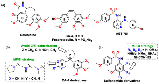 (a) Chemical structures of some representative colchicine-site ligands. Rings A, B, and C are indicated; (b) chemical modifications of CA-4 derivatives to avoid Z/E isomerization and improve aqueous solubility through the masked polar group incorporation (MPGI) strategy applied to ring B; (c) MPGI strategy applied to ring A of sulfonamide derivatives.