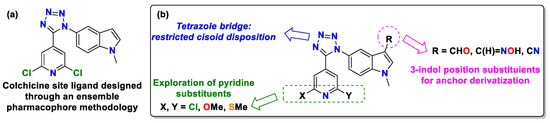 Unfortunately, besides the increasing efforts to develop antimitotics targeting the colchicine site, small percentages of new colchicine ligands with improved pharmacokinetic properties have been shown to maintain high antimitotic potency in the low nanomolar range exerted by CA-4 [42], thus extending the medicinal chemistry campaigns with too many cycles of drug design, synthesis, and biological evaluation [43]. To shorten and optimize the design process, in a previous work, we developed a computational screening methodology that succeeded in designing a new active molecule targeting the colchicine site. The method was based on an ensemble pharmacophore generated from more than eighty published X-ray structures of tubulin in complex with colchicine site ligands. The ensemble pharmacophore was used to search the ZINC database, where more than 8000 structures were selected and evaluated by two different pharmacophore-matching programs. After examining the information we obtained via virtual screening, we identified some structural elements for the design of a new compound family, namely, indole, tetrazole, and halogenated pyridine, and we proposed the synthesis and evaluation of 5-(5-(2,6-dichloropyridin-4-yl)-1H-tetrazol-1-yl)-1-methyl-1H-indole (Figure 2a). The synthesized compound exhibited high potency as a tubulin polymerization inhibitor and antiproliferative activity in the nanomolar range against human epithelioid carcinoma HeLa cells (IC50 of 45 nM), showing the ability to cause mitotic arrest and microtubule network disruption [44]. The substitution pattern of the tetrazole scaffold allowed the compound to adopt a conformation adapted to the A-B subpockets of the colchicine binding site. The aromatic rings lacked hydroxyl groups, which are prompted to be subjected to metabolization, and the endocyclic heteroatoms helped improve the water solubility of the compound. According to docking studies, the compound demonstrated the ability to establish favorable interactions with the aminoacid residues of the colchicine site through the chlorine and nitrogen atoms, and the size of the aromatic rings was suitable, facilitating interactions in the A-B zone.