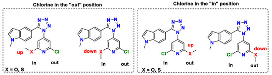 The docking results show that the conformations adopted in the tetrazole series also condition the interactions with tubulin, thus suggesting that it has an important role in the different observed binding modes. As shown in the subsequent molecular docking section, when the substituents in the pyridine ring are different (2-chloro-6-methoxy and 2-chloro-6-methylsulfanyl derivatives), the preferred docking poses place the chlorine in the “out” position. Regarding the “up” and “down” conformations of the methyl groups, the “up” dispositions are found to be preferable since this ensures that the size of the A ring is more similar to the trimethoxyphenyl ring of CA-4, thus accounting for better interactions in the A zone. The relative energies for the different geometries and the preferred docking poses are depicted in Figure 6.