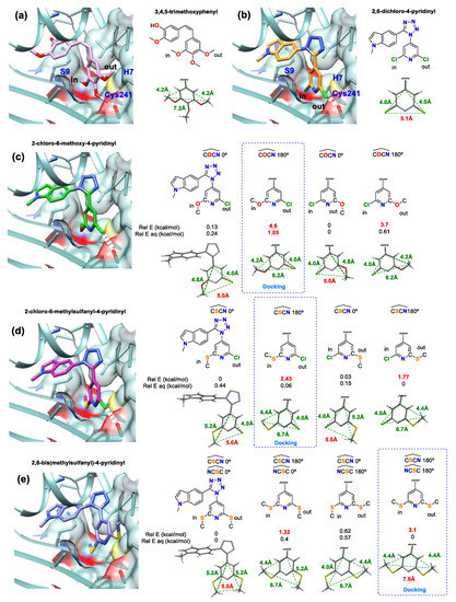 Docking scores are not accurate enough to correctly predict the rank order for the compounds, as previously noted for related families [53,54,55]. Therefore we attempted to justify the observed structure–activity relationships for the tetrazole series by jointly considering the docking and conformational studies. The preference for one chlorine ligand on the pyridines suggests that it makes an important interaction with tubulin. The docking results show that the out chlorine atom is located close to the carbonyl oxygen of Val238β (H7), making a halogen bond (Figure 6b–d). The rank order for the antimitotic potency of the “in” substituents can then be accounted for by a combination of conformational preferences and the size of the lateral substituents of the pyridine. With the chlorine in the out disposition, the methoxy and the methylsulfanyl substituents bind in the same “in” dispositions; however, the energetic penalty is much higher for the former, therefore explaining its lower potency (Figure 6c,d). The dichloropyridines do not have conformational penalties, but their smaller size results in slightly poorer packing within the pocket, thus explaining the observed intermediate potency between the other two (Figure 6b). Finally, the pyridine with the two methylsulfanyl substituents lacks the halogen bond and is too wide to fit in the site (Figure 6e), thus explaining the lower potency. These interactions cannot occur in the related diarylmethane series [54] due to the wider angle between the rings enforcing a different interaction of the substituents with the target, thus explaining the observed differences in the structure–activity relationships for these two structurally similar families of colchicine site ligands.