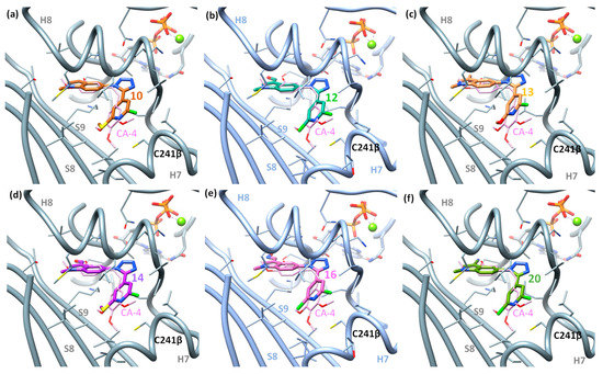 Docking poses for selected compounds in complex with tubulin (5JVD in blue and 5H7O in gray cartoons) superposed onto the X-ray structure of combretastatin A-4 (CA-4), which is depicted in light pink: (a) Compound 10 (carbons in orange); (b) compound 12 (carbons in turquoise); (c) compound 13 (carbons in yellow); (d) compound 14 (carbons in purple); (e) compound 16 (carbons in pink); (f) compound 20 (carbons in olive). The structural elements forming the colchicine-site zones are indicated, along with interacting sidechains. The superimposition with the structure of CA-4 shows the high similarity between the binding modes of the two ligands.