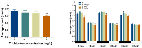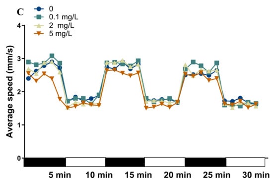 The locomotor activity of the zebrafish larvae at 144 hpf was assessed with a continuous light for 10 min and a 30 min dark-to-light stimulation program (Figure 2). Exposure to 5 mg/L of trichlorfon significantly reduced the mean locomotor speed of the larvae under the continuous light stimulation period (p < 0.01; Figure 2A). During the dark–light transition period, locomotor traces of the larvae were observed (Figure 2C). In the first dark (p < 0.05; Figure 2B) and second dark phase (p < 0.01; Figure 2B), the mean locomotor speed of the larvae was significantly reduced in the 5 mg/L exposure group. In the third dark phase, the mean locomotor speed of the larvae was increased in the 5 mg/L exposure group (p < 0.05; Figure 2B). In the first light phase, a significant decrease in larval swimming speed was observed upon exposure to 2 mg/L (p < 0.01; Figure 2B) and 5 mg/L (p < 0.01; Figure 2B) of trichlorfon. In the second light phase, the mean locomotor speed of the larvae was significantly reduced in the 5 mg/L group (p < 0.001; Figure 2B).