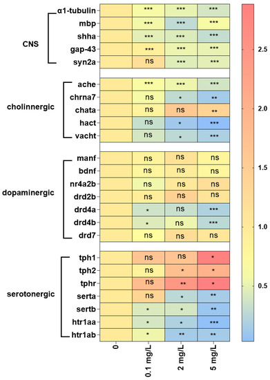 The expression levels of genes related to the cholinergic, dopaminergic and serotonergic systems after exposure to trichlorfon are shown in Figure 3. Cholinergic system genes included acetylcholinesterase (ache), nicotinic acetylcholine receptor α7 subunit (chrna7), choline acetyltransferase a (chata), high-affinity choline transporter (hact) and vesicular acetylcholine transporter (vacht). The downregulation of ache was observed by 1.67-, 1.86- and 2.64-fold at 0.1, 2, and 5 mg/L of trichlorfon, respectively (Figure 3). Chrna7, hact and vacht were significantly downregulated by 3.48-, 8.73- and 3.68-fold at 2 mg/L and by 7.18-, 31.34- and 5.47-fold at 5 mg/L of trichlorfon (Figure 3). Chata was significantly upregulated by 1.38-fold after exposure to 5 mg/L of trichlorfon (Figure 3). Dopaminergic system genes included mesencephalic astrocyte-derived neurotrophic factor (manf), brain-derived neurotrophic factor (bdnf), nuclear receptor subfamily 4, group A, member 2b (nr4a2b) and dopamine receptor (drd2b, drd4a, drd4b and drd7). The downregulation of drd4a and drd4b was observed by 2.77- and 2.26-fold at 0.1 mg/L and by 4.99- and 3.67-fold at 5 mg/L of trichlorfon, respectively (Figure 3). There were no significant differences in manf, bdnf, nr4a2b, drd2b and drd7 between the exposure groups and the control group (Figure 3). Serotonergic system genes included tryptophan hydroxylase (tph1, tph2 and tphr), serotonin transporter (serta and sertb) and 5-hydroxytryptamine receptor (htr1aa and htr1ab). The upregulation of tph1 was observed by 2.11-fold after exposure to 5 mg/L of trichlorfon (Figure 3). Tph2 and thpr were significantly upregulated by 1.76- and 2.47-fold, respectively, at 2 mg/L of trichlorfon and by 1.98- and 2.88-fold, respectively, at 5 mg/L of trichlorfon (Figure 3). The downregulation of serta was observed by 3.70- and 6.57-fold after exposure to 2 and 5 mg/L of trichlorfon, respectively (Figure 3). Sertb, htr1aa and htr1ab were significantly downregulated by 2.32-, 2.51- and 1.84-fold, respectively, at 0.1 mg/L of trichlorfon, by 2.51-, 5.08- and 1.73-fold at 2 mg/L of trichlorfon and by 11.28-, 24.01- and 7.15-fold at 5 mg/L of trichlorfon (Figure 3).