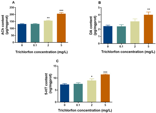 We examined the concentrations of ACh, DA and 5-HT (Figure 4). The ACh content was significantly increased by 18.39% and 55.67% at 2 mg/L and 5 mg/L of trichlorfon, respectively (Figure 4A). The DA content was significantly increased by 45.48% in the 5 mg/L group (Figure 4B). The content of 5-HT was significantly increased by 13.67% and 50.39% at 2 mg/L and 5 mg/L of trichlorfon, respectively (Figure 4C).