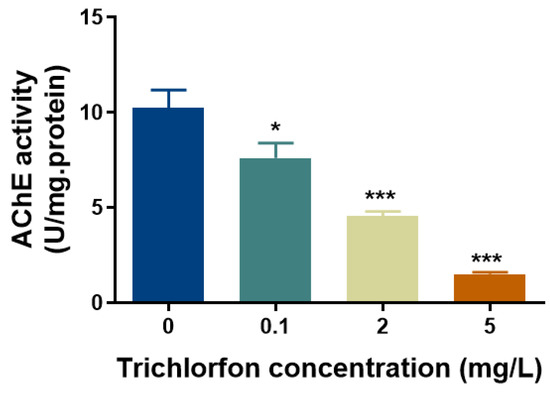 Acetylcholinesterase (AChE) activity in response to trichlorfon. AChE activity in zebrafish larvae was measured following exposure to various concentrations of trichlorfon (0, 0.1, 2 and 5 mg/L) until 144 hpf. All data are expressed as the mean ± SEM value (n = replicates, 40 larvae per replicate). * p < 0.05 and *** p < 0.001 compared to the control group.
