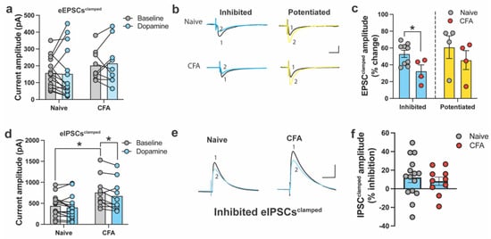 We obtained 10–15 min of stable baseline currents for eEPSCsclamped (Vh = −60 mV) and eIPSCsclamped (Vh = 0 mV), before and after the bath application of DA. In ACC neurons, eEPSCsclamped did not differ between naïve and CFA-treated mice, and DA did not significantly inhibit eEPSCsclamped in either condition (Figure 1a). This was surprising, given that we previously showed DA inhibition of eEPSCs in the ACC of slices from naïve and CFA-treated mice []. However, a primary difference between the current work and our previous studies is that our prior work recorded eEPSCs in the presence of pharmacological blockers (e.g., picrotoxin, CGP-55845, APV). We noted that following DA application, eEPSCsclamped were either inhibited (naïve: 9/15 of eEPSCs; CFA: 4/9 of eEPSCs) or potentiated (naïve: 4/15 of eEPSCs; CFA: 4/9 of eEPSCs). Some neurons in both groups were unresponsive to DA application (naïve: 2/15 of eEPSCs; CFA: 1/9 of eEPSCs). Thus, neurons were separated and analyzed based on whether they showed an overall inhibitory or potentiated response. Statistical comparison between the degree of eEPSCclamped inhibition or potentiation as the percentage change of the baseline revealed a significantly higher level of inhibition of eEPSCs in naive slices relative to the CFA condition, which aligns with our previous findings []. At the same time, no differences emerged between potentiated eEPSCs (Figure 1b,c).