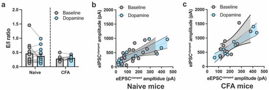 The overall E/I ratio between naïve and CFA-treated mice was not different or altered by DA in either group (Figure 2a). To further understand whether DA disproportionally influenced the relationship between eEPSCsclamped and eIPSCsclamped within individual neurons, eEPSCsclamped and eIPSCsclamped amplitudes were plotted against each other. A linear relationship between eEPSCsclamped and eIPSCsclamped in ACC neurons was found for naïve and CFA-treated mice, before and after DA application (Figure 2b,c). The regression slopes did not differ for naïve and CFA-treated mice following DA application, suggesting that CFA-induced inflammation did not alter the E/I balance of DA in the ACC neurons (Figure 2b,c).