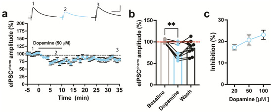 Previous work demonstrated that activation of DA receptors in ACC brain slices inhibits pharmacologically isolated AMPAR-mediated EPSCs (eEPSC) in the ACC of naïve mice [,,]. However, this was not true for evoked EPSCs recorded without pharmacological isolation (i.e., eEPSCclamped). Given that we previously showed DA inhibits pharmacologically isolated eEPSCs in an earlier study [], we sought to pharmacologically isolate GABAergic currents in the ACC and determine whether DA modulates these responses when pharmacologically isolated. Thus, we recorded GABAAR-mediated eIPSCs (Vh = 0 mV) that were pharmacologically isolated by including CNQX, APV, and CGP-55845 in the slice bath to block AMPA, NMDA, and GABAB receptors, respectively. Pharmacologically isolated eIPSCs, referred to as eIPSCpharm, were blocked by the application of PTX (100 μM), a GABAAR blocker indicating that GABAARs mediated this current. The transient application of DA (50 μM) for 10 min significantly inhibited GABAergic eIPSCspham in the ACC of naïve mice (Figure 4a). Subsequently, washing out DA from the bath reversed this inhibition (Figure 4b). DA at 20 μM and 100 μM also inhibited eIPSCs, but this inhibition was not significantly different from that of the 50 μM application of DA (Figure 4c).