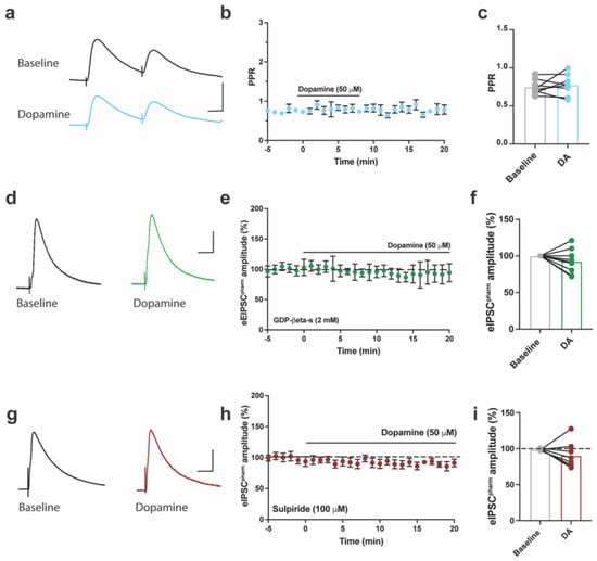 To test whether the inhibitory effect of DA on eIPSCspharm occurred via a pre- or postsynaptic mechanism, we measured the paired–pulse ratio of eIPSCspharm at baseline and following DA application (Figure 5a–c). DA did not induce a significant change in the PPR of eIPSCspharm (paired t-test, t7 = 0.6, p = 0.55; Figure 5b,c). However, postsynaptic inhibition of G-protein activity by guanosine 5′-[beta-thio] diphosphate (GDP-β-S; 2 mM) occluded the inhibition of eIPSCspharm by DA (Figure 5d–f). Since sulpiride (100 μM), a D2R antagonist, blocks the DA-mediated inhibition of pharmacologically isolated eEPSCs [], we tested whether inhibiting eIPSCs in the ACC operated via a similar mechanism. DA no longer inhibited eIPSCspharm when co-applied with sulpiride (Figure 5g–i). These results indicate that postsynaptic D2 receptors, coupled with GPCR activation, induce the inhibition of eIPSCspharm in the ACC, in a mechanism similar to the DA-induced inhibition of eEPSCspharm in mouse brain slices [].