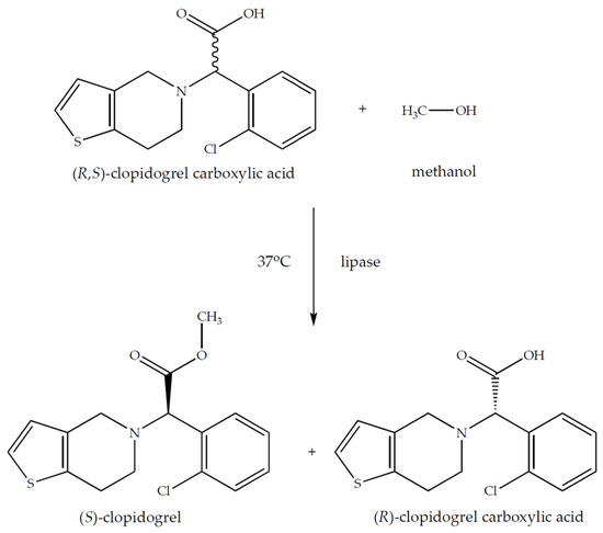 Enantioselective esterification of (R,S)-clopidogrel carboxylic acid with the use of Candida rugosa lipase as the biocatalyst. The reaction mixture consisted of (R,S)-clopidogrel carboxylic acid (3.5 mg, 0.01 mM); methanol (3.0 µL, 0.25 mM); lipase from Candida rugosa OF (10.0 mg); and n-hexane, n-heptane, or cyclohexane (5 mL) with or without the addition of an ionic liquid (100 µL), and was incubated for 5 days (120 h) along with shaking (250 RPM) at 37 °C.