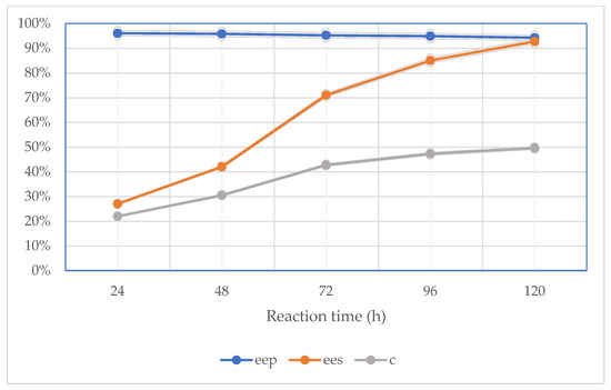 Effect of reaction time on the enzymatic parameters of performed kinetic resolution of (R,S)-clopidogrel carboxylic acid in the two-phase catalytic system consisting of [EMIM][BF4] and cyclohexane, including values of enantiomeric excesses of both substrates (ees) and products (eep) as well as conversion (c) and enantioselectivity (E).