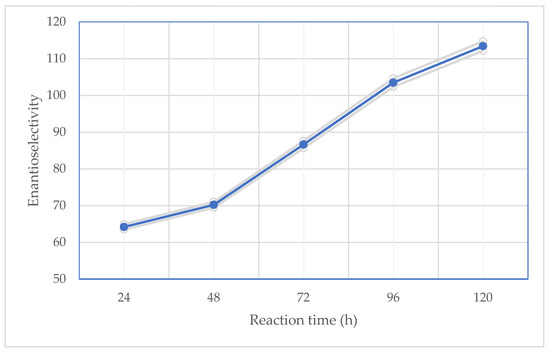 Effect of reaction time on the enzymatic parameters of performed kinetic resolution of (R,S)-clopidogrel carboxylic acid in the two-phase catalytic system consisting of [EMIM][BF4] and cyclohexane, including values of enantioselectivity (E).