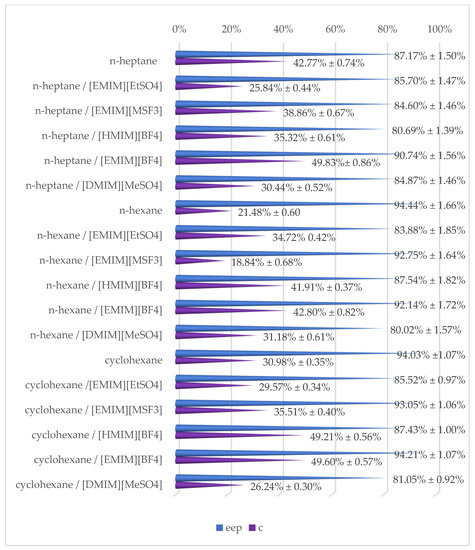 Racemic clopidogrel carboxylic acid was fully dissolved in [EMIM][EtSO4], [EMIM][MSF3], [HMIM][BF4], [EMIM][BF4], or [DMIM][MeSO4], and then one of the organic solvents was added. The best kinetic resolution parameters were observed for the system containing [EMIM][BF4] and cyclohexane. In all the tested reaction systems, the enantiomeric excesses of products were higher than 80% (Figure 4). Based on the previously described studies, biotransformation could be considered enantioselective if the E-ratio is higher than 20. In Figure 5, the E-ratios of the tested systems are summed up. Each system without the addition of ionic liquids could be considered enantioselective. Nevertheless, the addition of an ionic liquid could increase the enantioselectivity of the kinetic resolution of the clopidogrel carboxylic acid.
