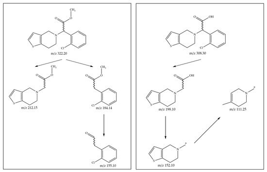 Fragmentation pathways for molecular ions of (R,S)-clopidogrel (m/z 322.20) and (R,S)-clopidogrel carboxylic acid (m/z 308.30).