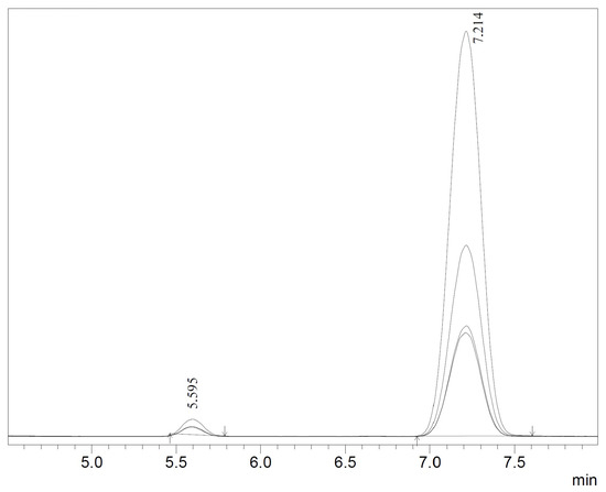 Chromatogram of (R,S)-clopidogrel after 120 h of kinetic resolution of (R,S)-clopidogrel carboxylic acid with the use of Candida rugosa OF in two-phase reaction media containing [EMIM] [BF4] and cyclohexane: (R)-clopidgorel (tR = 5.595 min) and (S)-clopidogrel (tR = 7.214 min). Chromatographic conditions: Lux Cellulose-3 (4.6 × 250 mm × 3 μm) column, mobile phase: methanol/formic acid (100/0.1 v/v), FR = 0.8 mL/min, t = 20 °C.