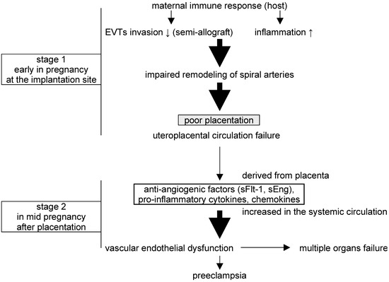 Preeclampsia (PE) is a serious, life-threatening disease that afflicts hypertensive pregnant women with symptoms that can include proteinuria, headaches, fetal growth restriction (FGR), liver and kidney dysfunction, seizures, and abnormal blood tests for coagulation and fetal factors. The development of PE often improves following delivery and may involve placental-derived factors, and a two-stage theory has been proposed to explain the pathogenesis [1,2] (Figure 1). In the first stage, extravillous trophoblasts (EVTs), which invade the uterine endometrium and myometrium in the first trimester of normal pregnancy, become functionally impaired, leading to disturbed remodeling of the spiral artery and poor placentation with uteroplacental ischemic defects. In the second stage, this dysfunctional placenta releases humoral factors into the maternal systemic circulation that lead to multi-organ damage and the hallmark symptoms of the disease. These factors, which include proinflammatory cytokines (e.g., tumor necrosis factor-alpha (TNFα), and interferon-gamma (IFN-γ)) and vasoactive substances (e.g., endothelin-1 (ET-1), thromboxane A2, and angiotensin II), can increase vasoconstriction, vascular permeability, and coagulopathy [3,4,5,6].