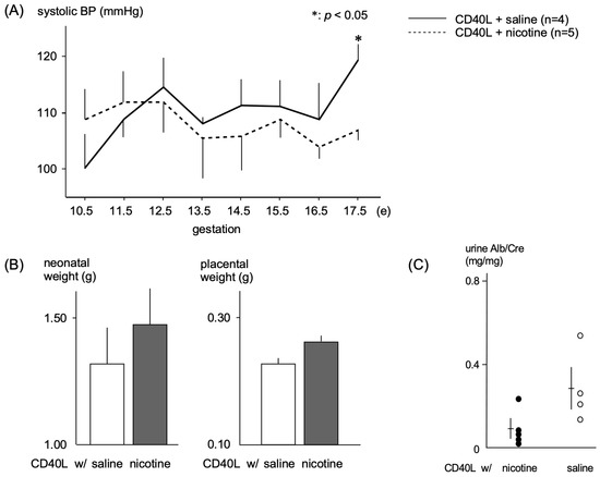 Birth weights of pups were lower in the CD40L control group (1.31 ± 0.41 g, n = 9) than the nicotine-treated group (1.46 ± 0.35 g, n = 7), and placental weight was slightly lower in the control group (0.23 ± 0.03 g, n = 9) compared with nicotine-treated mice (0.26 ± 0.03 g, n = 5), though these results did not reach statistical significance (Figure 2B). The urinary albumin/creatinine ratio was lower in nicotine-treated mice (0.08 ± 0.04 g, n = 5) than control mice (0.35 ± 0.11 g, n = 4) (Figure 2C).